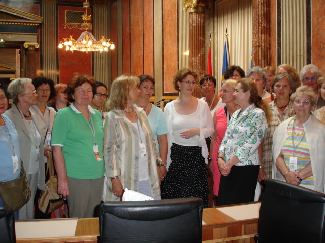Austria held the Presidency of the Council of the European Union during the first term of 2006. Therefore, Vienna was a natural choice for the European Women’s Circle’s politico-cultural destination in June 2006. In addition, in 2006 the Mozart year was celebrated in Vienna, City of the Waltz, of baroque palaces, churches, glamorous boulevards, winding alleys, cafés, and proverbial charm. Vienna was and is one of the largest and most important cities in and for Europe. The Habsburg dynasty ruled over its mighty empire out of Vienna since the middle of the 15th century and shaped the European history for centuries. The extensive cultural program led the group to the Hofburg Palace, St. Stephen’s Cathedral, the Museum of Art History, the treasury with the Imperial Crown of the Holy Roman Empire, and to Schönbrunn Palace. The trip’s highlight was a performance of Mozart’s “The Magic Flute” in the world-renowned Vienna State Opera House. The European Women’s Circle was cordially received in the Austrian parliament by Christine Marek, MP for the ÖVP and State Secretary with the Federal Department of Economy and Employment. She personally guided the group on a tour of the historic parliamentary building and answered any and all questions. During the ensuing discussion she informed the group about current Austrian politics and talked about the political work of women, as well as the percentage of female members of parliament. While the number of women volunteering and successfully working outside the established political institutions is disproportionally high, their numbers dramatically lag behind those of their male colleagues when it comes to candidacies for office. It is good to know that women in all EU member states show solidarity by working together towards a change of this situation. In this way, common interests and goals lead to a greater unification of citizens of the European Union. |