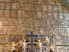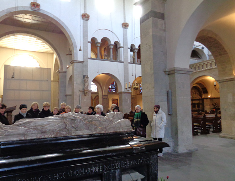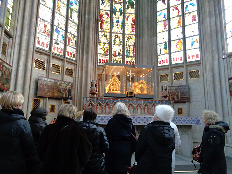 On February 27, 2018 the European Women's Circle toured with a professional guide St. Ursula in Cologne. This church is an example of the European Romanesque ecclesiastical architecture. After destruction of the predecessor edifice from 4th century the contemporary important church of St Ursula was build in the 9th century in place of former roman cemetery. The discovery of so many bones fired the imagination of people. So the 11 companions of St Ursula on her way across Europe became 11.000 virgins, sustaining martyrdom in Cologne. The great plats and the wonderful holy shrine in the apse bear witness to the legend. In the ossuary of this church, the "Golden Chamber", many reliquary caskets are shown and lots of bones forming different designs on the walls. After the destruction of the Second World War St Ursula was rebuilt. |